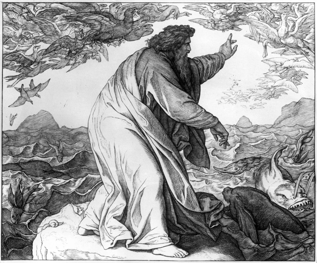 Der fünfte Schöpfungstag. Gott bei der Erschaffung der Tiere. Zeichnung von Julius Schnorr von Carolsfeld (1794-1872)